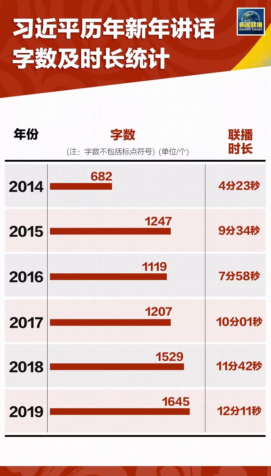 統(tǒng)計發(fā)現(xiàn),6篇新年賀詞,除去標點總字數(shù)有7000多字,平均每篇1000多字。其中,字數(shù)***少的一篇是2013年12月31日發(fā)表的新年賀詞,字數(shù)為682字;字數(shù)***多的一篇是2018年12月31日發(fā)表的新年賀詞,字數(shù)為1645字。
