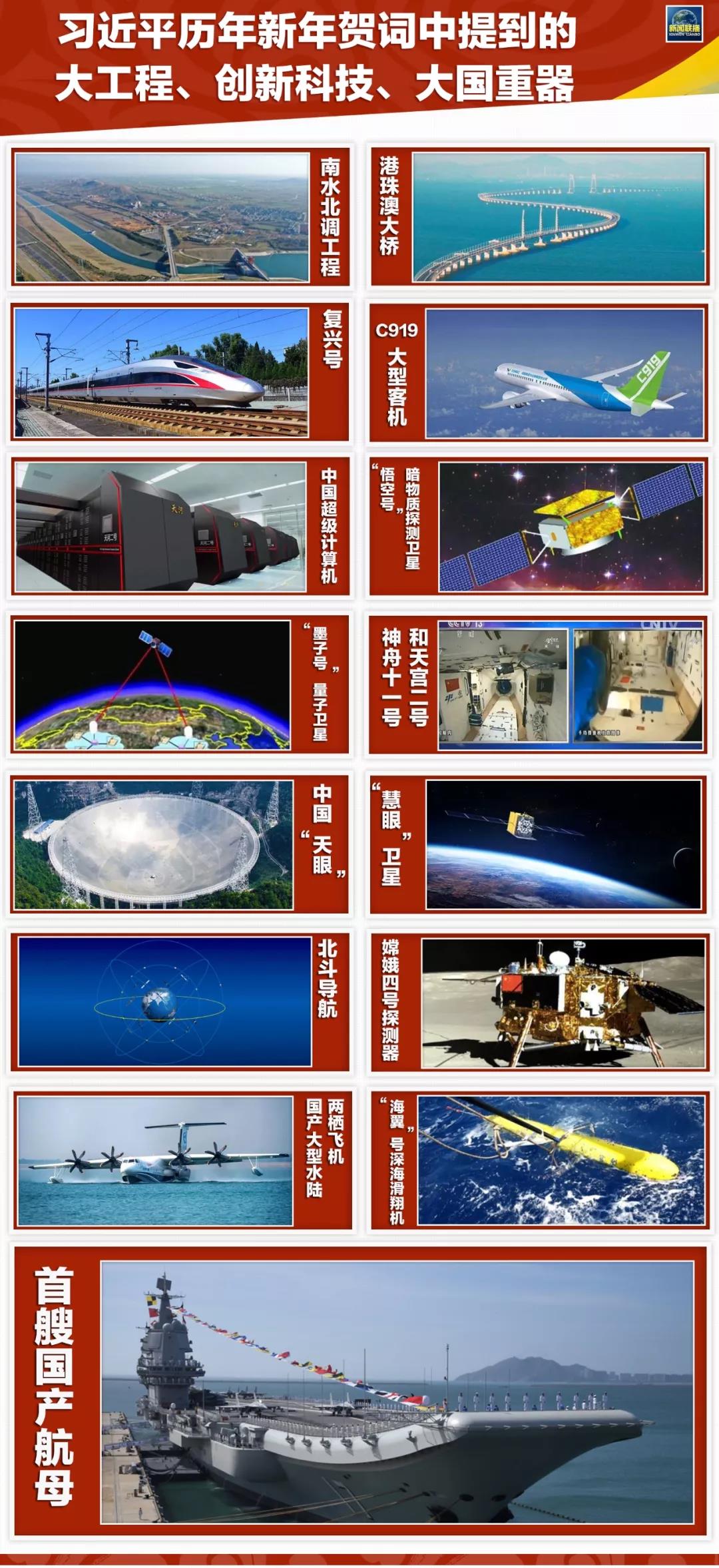 習主席的新年賀詞,還多次提到我國的一些大工程和科技創(chuàng)新成果,有的還不止一次被提及。比如,“國產(chǎn)航母”“暗物質(zhì)探測衛(wèi)星”等就都被提到了兩次。